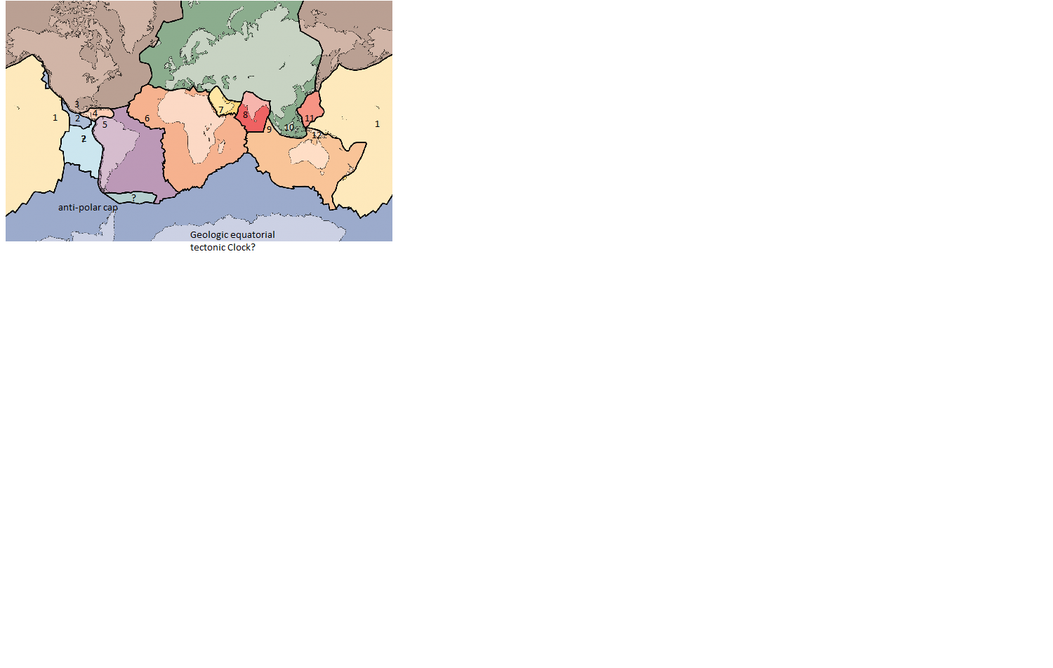 Note: 12 plates subdivide Earth at equator, with one additional south pole plate. (I modified the map, adding the equatorial numbers. Click to enlarge)